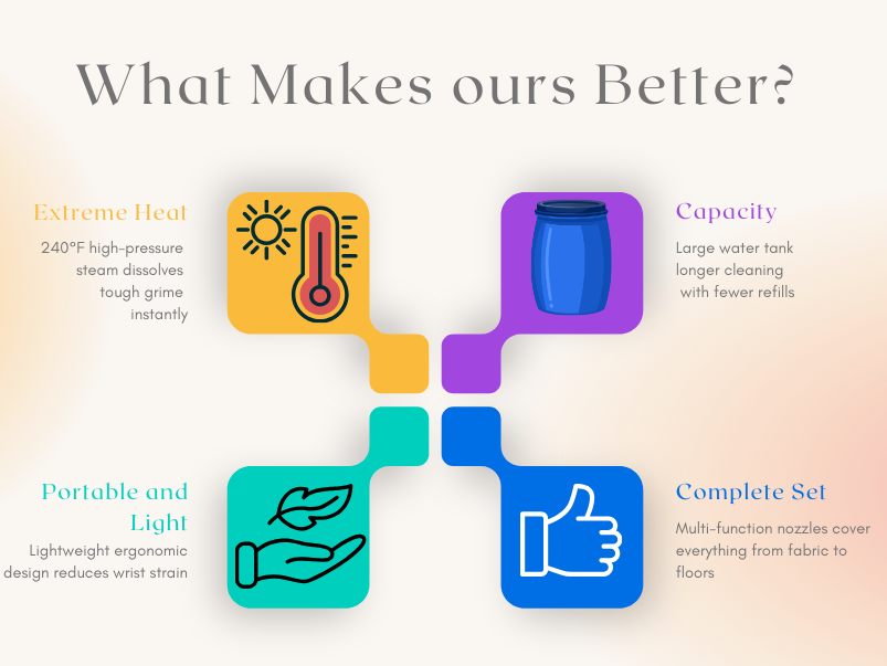 With 240°F high-pressure steam and included nozzles, our steamer delivers far more power than competitors.